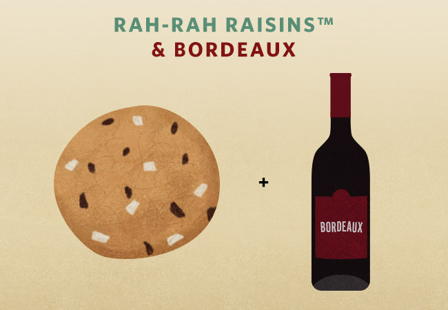 Rah-Rah Raisins™ are oatmeal cookies with raisins and Greek yogurt-flavored chunks that need a heavily merlot based wine like a left bank Bordeaux.
