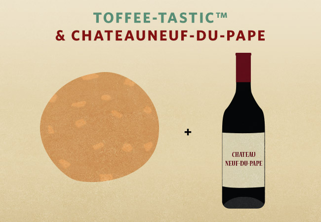 Toffee-tastic™ cookies are buttery with toffee bits. While the toffee alone screams for a tawny port, accompanied with the cookie, a Chateauneuf-du-Pape, a red blend from southern Rhone valley, would be a better choice.