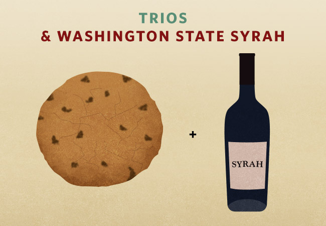 Trios are peanut butter oatmeal cookie chocolate chip cookies, which also happen to be gluten free. Pick a Washington State Syrah because the dark berry in the Syrah will work great with the peanut butter and chocolate chips.